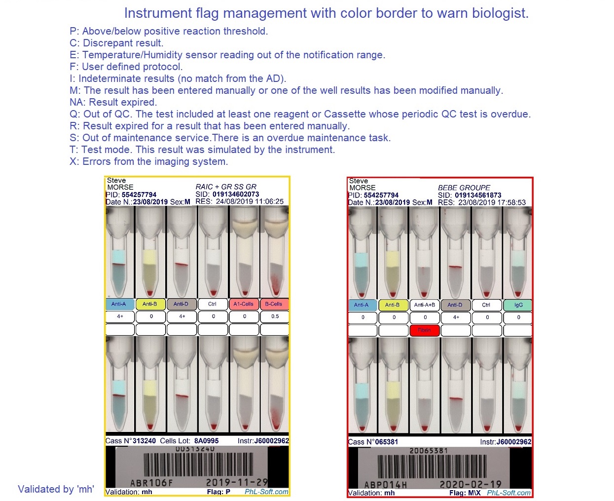 Each image consolidates test results, patient data, analytical context, and any detected anomalies (red highlighting, error codes, result modifications), enabling safer and better-documented result validation.